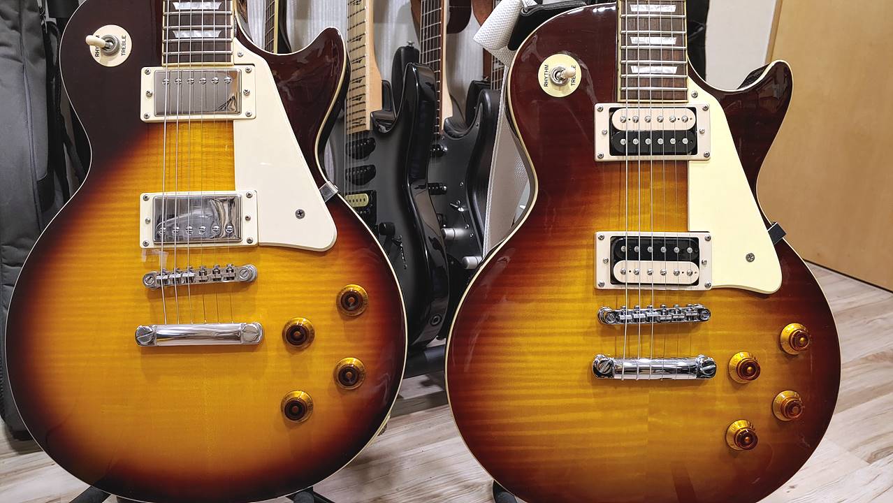 좌 에피폰 레스폴 스탠다드 프로, 우 덱스터 LP-200... 둘다 타바코 선버스트 인데.. 덱스터쪽의 무늬가 굵고 선명하다..