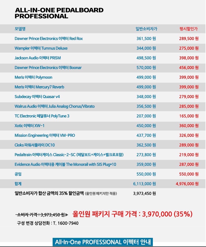 가격은 후덜덜.. 35%로나 깍아줘도.. 400만원이다.. 깁슨 히스토락 한대 값 ㅠ.ㅠ 이다. 하다보면 저리로 가는건 일도 아닐꺼다.. 저렴하게 구입해도 하나씩 살려면 하세월이고 궁금증이 도져서 오버드라브 서너개 디스토션 서너개 이렇게 사모으기 시작하면 끝도 없다. 페달 보드 사고.. 패치케이블 만들고 파워 꾸미고.. 자작 페달 만들고 -0-;; 생각해보면 재미는 나겠지만.. 당장은 아니라는 생각이 들었다.