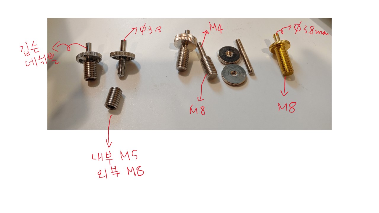 고또의 경우 M4를 M8로 변환해주는 걸 쓰면 포스트와 링을 네쉬빌과 똑같은 형태로 쓸수 있고 (이걸 주문했는데.. 바깥이 M10인 부품이 와서.. 사진엔 없다), 위의 사진처렁 위는 M4 아래는 M8인 2중 나사를 구입하면 링과 브릿지를 쓸수 있다. 링이고 뭐고 그냥 제일 단순하게 바꿀려면 마지막 금색의 녀석처럼 아래엔 M8 위는 약 3.8미리 원통 링이 일체형인 녀석을 구하면 된다. 이녀석은 원통 부분은 사포로 살살 갈면 깁슨 ABR도 붙여 쓸수 있는 장점이 있다. 하지만 네쉬빌은 브릿지 안착되는 부분이 살짝 돌출되어 있고 포스트의 나사산을 타고 링이 움직이는 타입은 암나사 수나사 사이의 틈 때문에 브릿지가 기울어도 (보통 1번줄 쪽은 낮게 6번줄 쪽은 높게 된다.) 브릿지가 깔끔하게 안착되는데 이 마지막 녀석은 브릿지가 링부분에 수평으로 딱 안착되지 않는다. 그래서 울림에 조금 문제가 있을수도 있을거 같다.