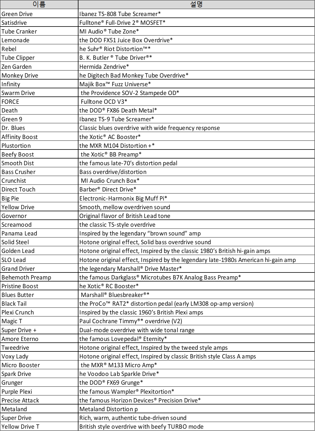 이 많은 목록이 현재 Xtomp mini에서 지원되는 드라이브 범주 페달이다. 뭐.. 부스터도 있긴한데. .암튼, 한번쯤 이름들어본 녀석들이 수두룩하다, GP-100에서 지원하는 녀석들은 당연히 있다.