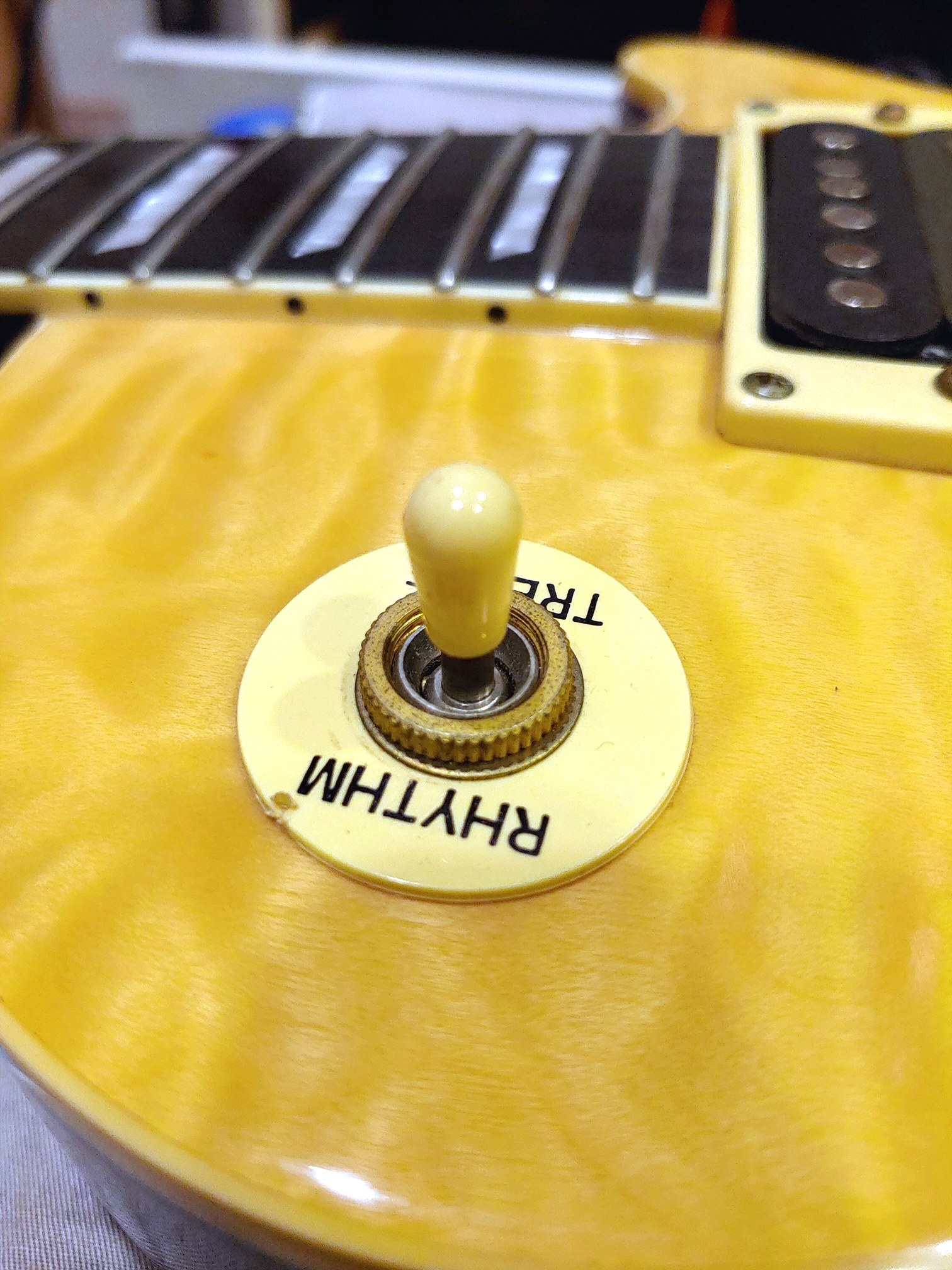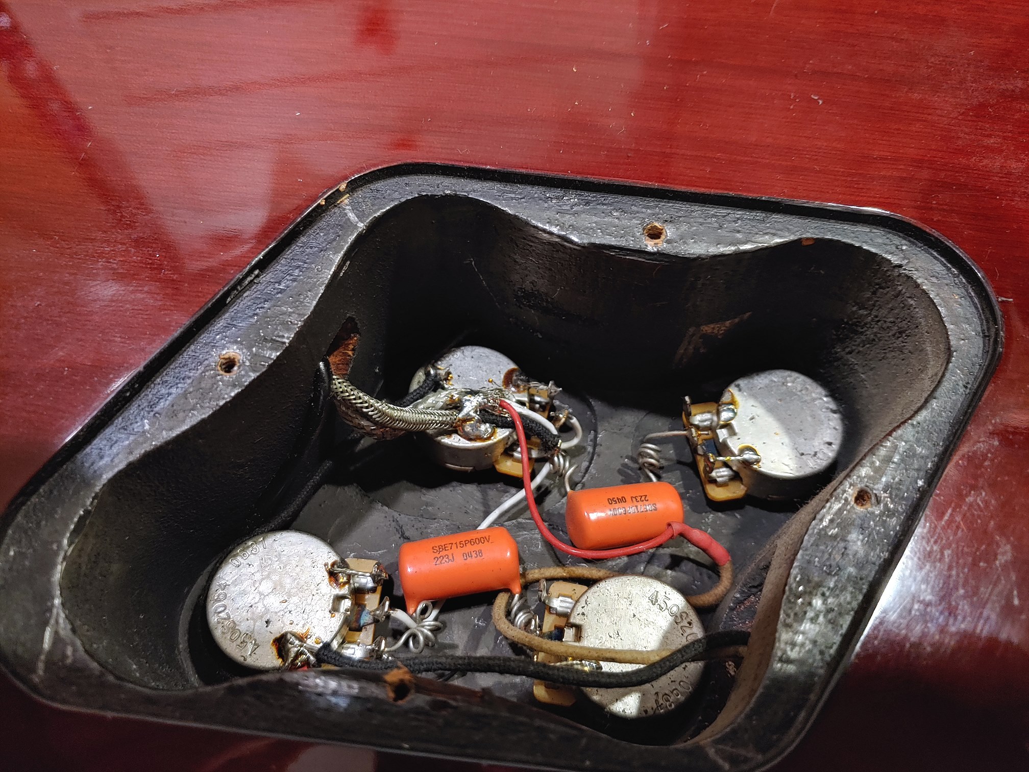 레독스 홈피에선 볼륨이 푸시풀 이라 했는데.. 내가 구한 녀석은 그냥 일반 버전이다.. CTS 팟에 오렌즈 드롭.. 이건 대량 구매하면 확실히 저렴해지는 부속이라 제조사 입장에선 생색내기 좋은 것들이다. 그렇다곤 하지만. 땜질 상태나 배선 정리는 정말 잘되어 있다. 지금은 기타 주인이 꽤 비용을 지불하고 잘하는 샵에 가야 만들수 있는 수준이다. (ㅡㅡ; 얼마전 그 에비뉴의 모디가 생각난다.. 아오.. 썅..)