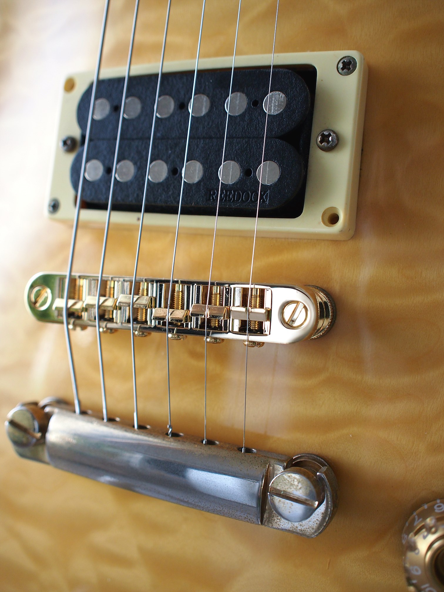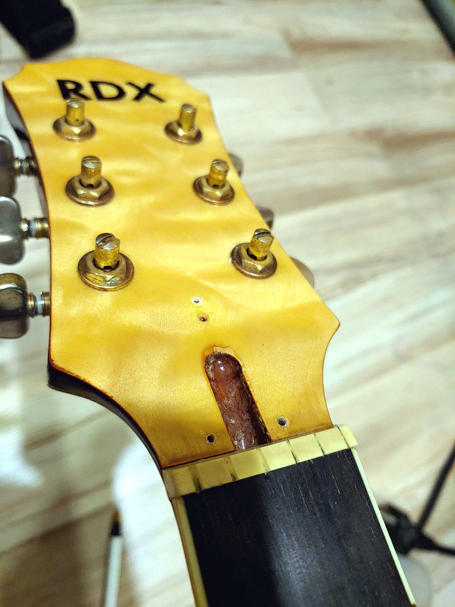 내가 산 RDX 613은 이미 말한 샤펠리 바디위에 17미리 하드메이플을 올리고 그위에 퀼티드 비니어 탑이 올라가 있다. 퀼티드 탑이 올라간 대부분의 기타는 비니어라고 보면 된다. 얼마전 토카이의 멋진 퀼티드 비니어탑이 올라간 레스폴이 내 잔잔한 (ㅜㅜ 사실 언제라도 흔들릴 각오가된) 지름 욕구를 흔들었었는데.. 조금만 더 내려라 내가 산다했는데.. 내리자 마자 누가 사가버렸다.