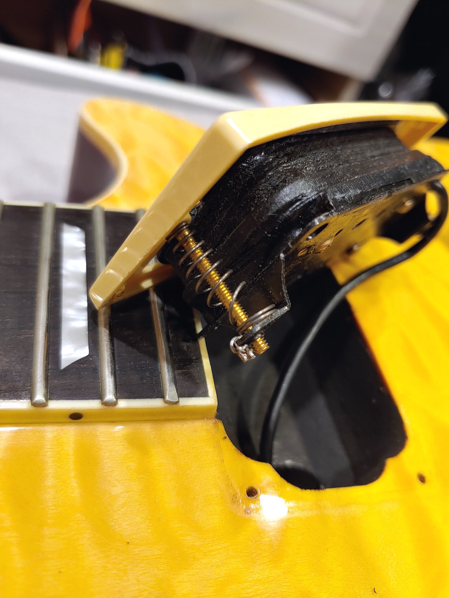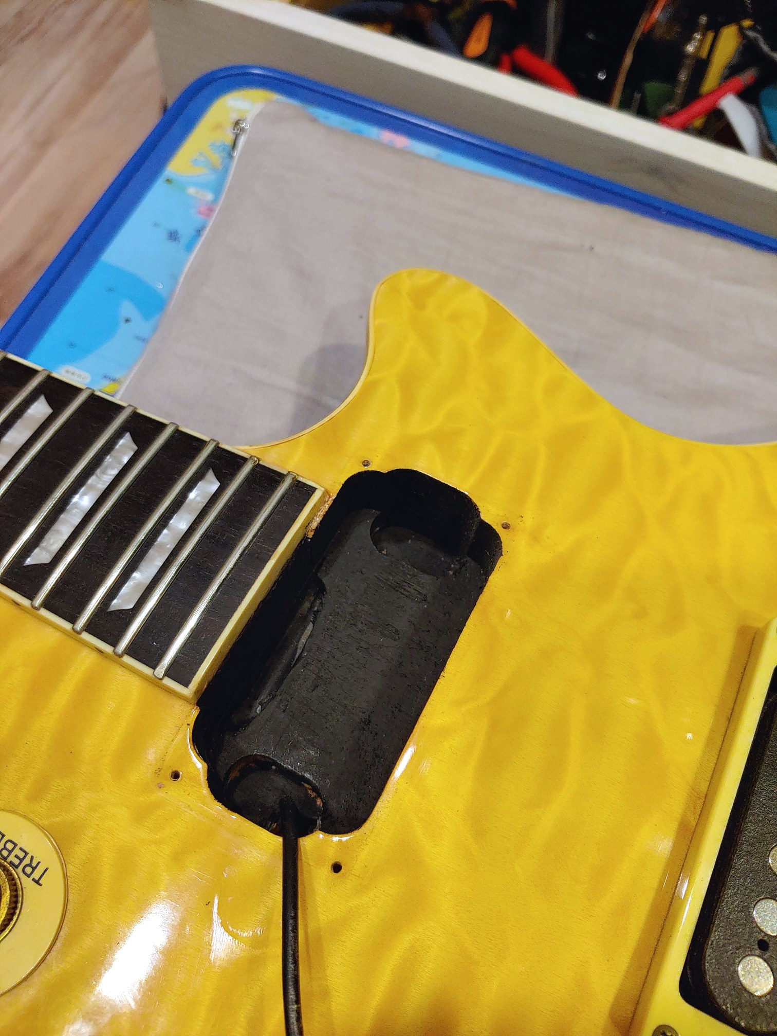 브릿지는 오래넌 성일 사장님께 연락해서 구입한 BM005? 이다. 소리가 매우 직선적일거 같은 기타인데.. 브릿지 포스트를 낭창한걸 꽂아주는건 왠지 안맞을 듯 해서.. 묵혀놓은 브릿지를 꺼내 달아 주었다. 원래 달려있던 브릿지는 오염이 너무 심해서.. 일단 세척 하고 어떻게 할지 고민해 봐야겠다.