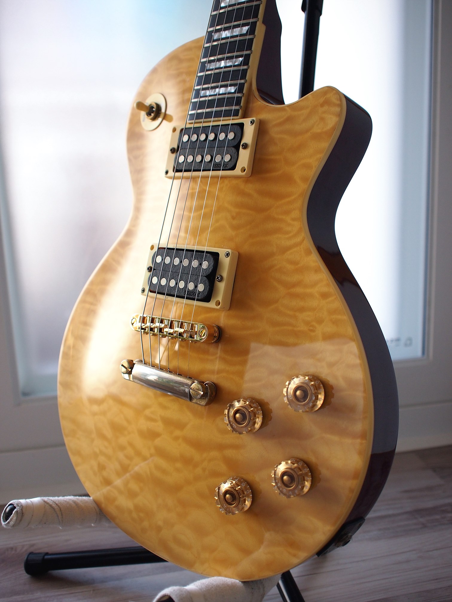 싱글 컷어웨이의 뾰족이 부분이 깁슨보단 많이 뭉퉁하다. 상판의 카빙은 예술적으로 들어갔다. 저 원피스의 퀼티드 탑이 날 설레게한다. 넘 맘에 든다. 맑은 대낮 수영장 바닥에 일렁이는 햇살같은 느낌 ㅠ.ㅠ.