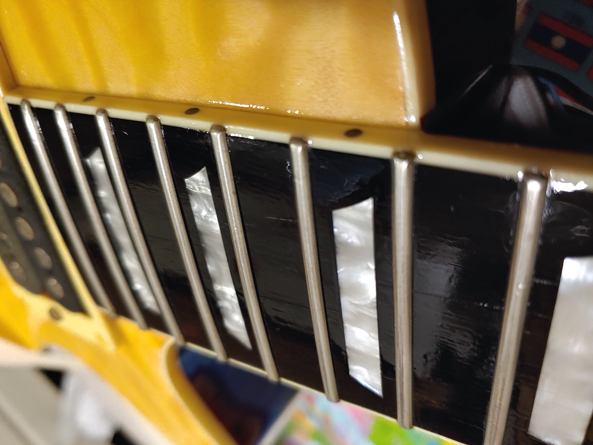 넥과 바디의 접합은 롱테넌이라고 하기엔.. 살짝 짧다.. 그리고 틈도 많다. 아마 CNC로 정밀 가공한게 아닌듯 하다.. 아주 옛날은 CNC 가 없어도 사람이 한땀한땀 갈아서 이가 딱 맞게 만들었겠지만.. 인건비기 비싸지니.. 최종적인 마무리 부분이 아쉽게 되고.. 그걸 최근엔 컴터가 연결된 기계가 해결해 가고 있다. 이기타를 만들땐.. 그 중간 어딘가였나 보다..