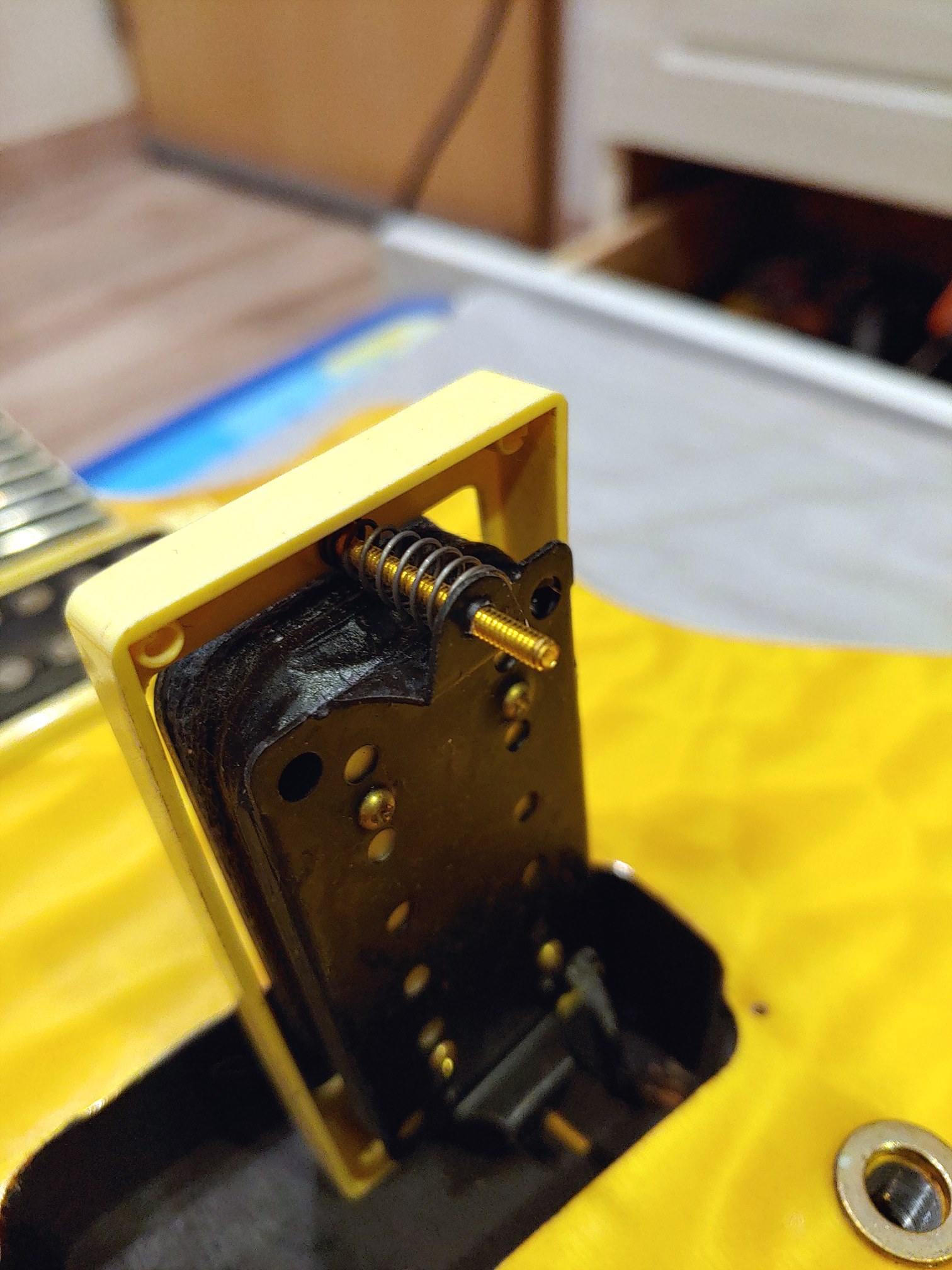 엥?? 넥 픽업은 뭐가 문제 였는지.. ㅡㅡ;;; 나사산 부분에 철사가 감겨 있따. 세상 살다 첨봤다. 뭐 픽업은 멀쩡하게 고정은 잘되네.. 근데 보면 스프링이!!!!! 삐꾸다.. 담번 줄갈때.. 라텍스 고무튭브로 바꿔 줘야 겠다. (깨알 같이 보이는 24프렛 삐구난 마감!!)