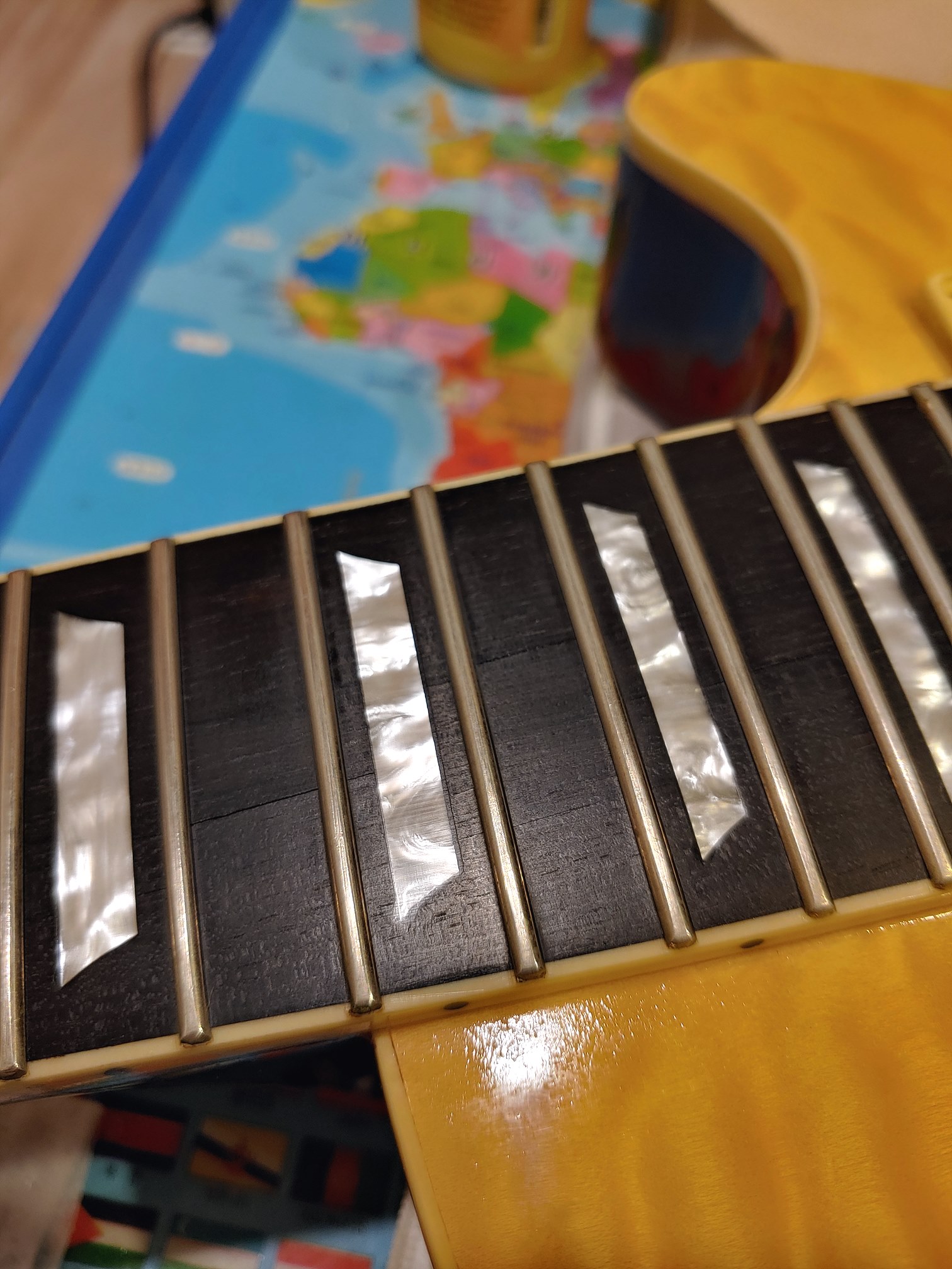 에보니 지판에 크랙이 좍좍.. 판매자는 자긴 몰랐다.. 레몬오일 좀 주면 나아지지 않겠냐 하는데.. 참 그렇다.. 에휴.,.. 나무가 갈라졌는 데 오일로 그게 붙냐고?? 에휴 말자.. 그냥 이제 저렴이 기타는 살때 꼼꼼하게 볼수 밖에 없다.. ㅡㅡ;; 담번엔 그냥 비싼 PRS 싱글컷을 사자~~ ( 결론이 병맛인가.ㅡㅡ;;)