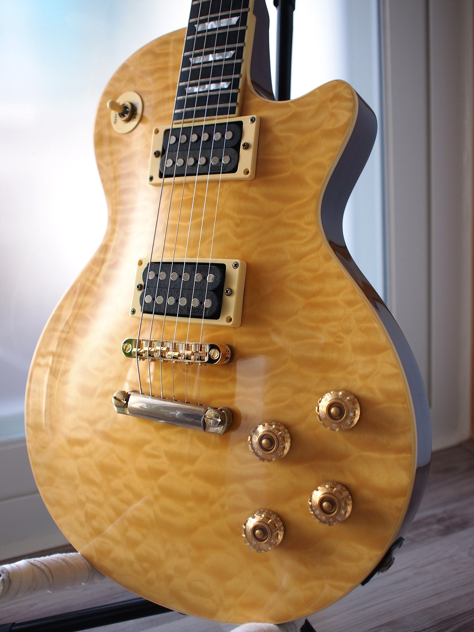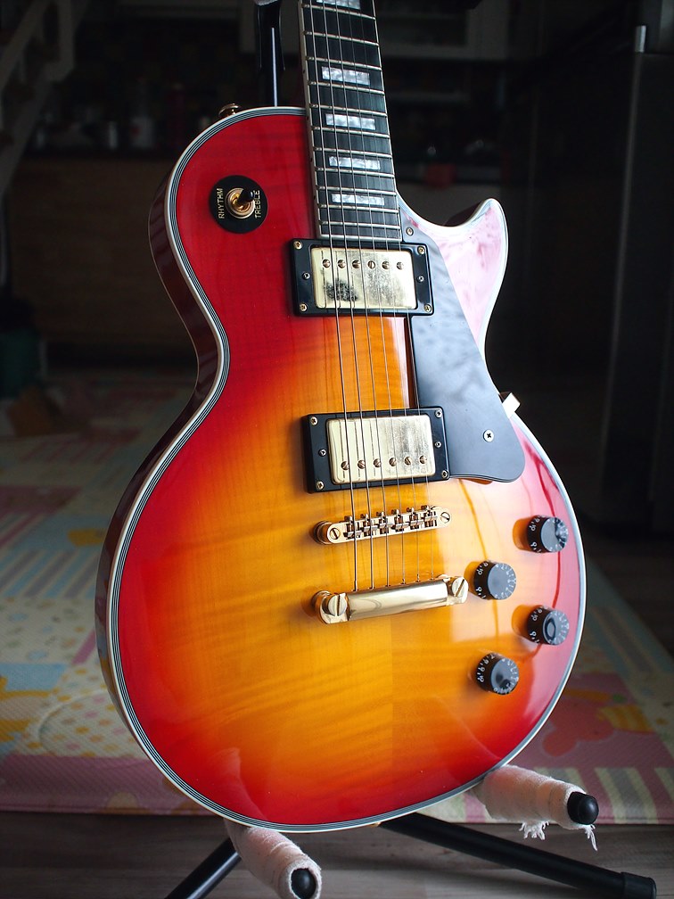 그냥 안팔고 가지고 있어야 할 듯한 코로나의 레스폴 카피 CLP Custom Plus.. 국산중엔 좀처럼 보기 어려운 비니어 아난 북매치 플레임 메이플 탑을 가진 기타.. 플레임이 좀 슴슴하긴 하지만.. 비니어가 없어서 소리는 더 트인 느낌..