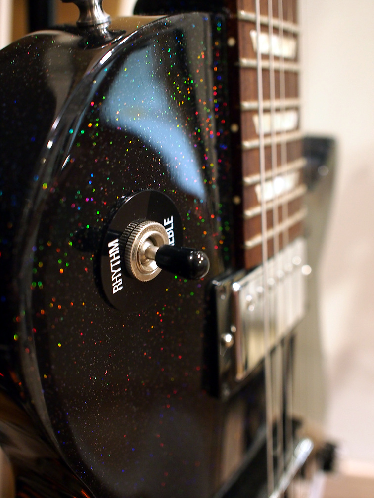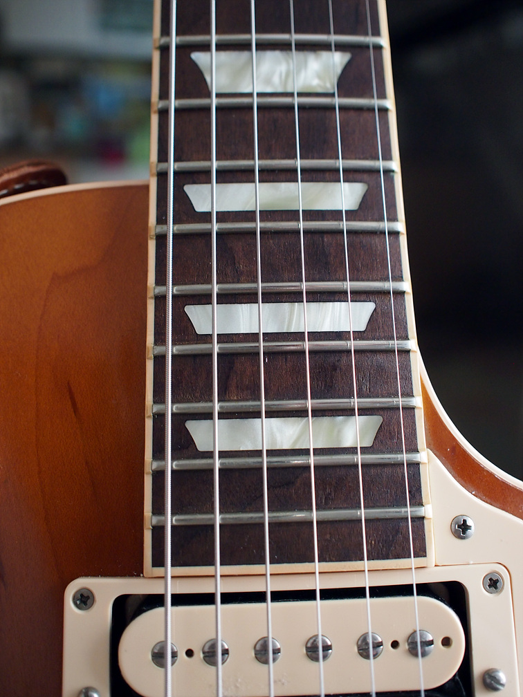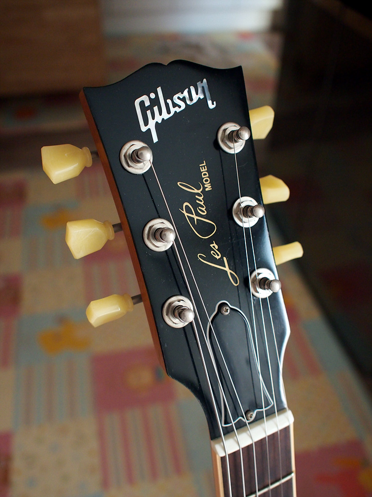 사진엔 안 나왔는데.. 깁슨 로고 아래로 클립 튜너의 고무 흔적이 남아있다. 잘 모르는 사람들이 너무 많은듯 한데. 깁슨의 라커 피니시는 클립 튜너의 고무, A자형 스탠드의 바디 닿는 부분의 완충제, 일반적인 스텐드의 바디와 넥에 닿는 완충제에 의해 침식당해 광을 잃어 버린다. 물론 뭐.. 레릭이라고 생각하고 작정하고 쓴다면 몰라도.. 그럴 의도가 없다면 완중제 닿는 부분엔 면으로된 커버를 씌우고, 클립튜너는 쓰고 빼두는 습관을 가지거나, 아예 페달형 튜너를 쓰는게 좋다. 스튜디오에도 헤드에 ㅠ.ㅠ 클립 튜너 자국이 깁슨 이름 좌우에 있어서.. ㅠ.ㅠ 슬프다.