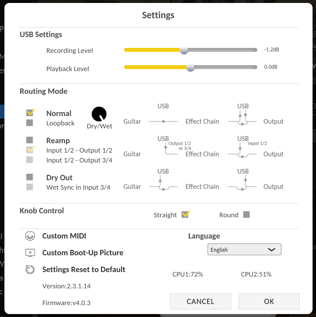 요렇게 쓸려면 Routing mode를 Normal로 하고 Dry/Wet 다이얼을 wet 100%로 만들어 줘야한다. 안그러면 DAW로 녹음된 최종 소리 말고 멀티가 만들어낸 소리가 섞여서 들리고 나중에 녹음된 결과를 들어보면.. 내가 아까 들었던 그게 아니게 된다.